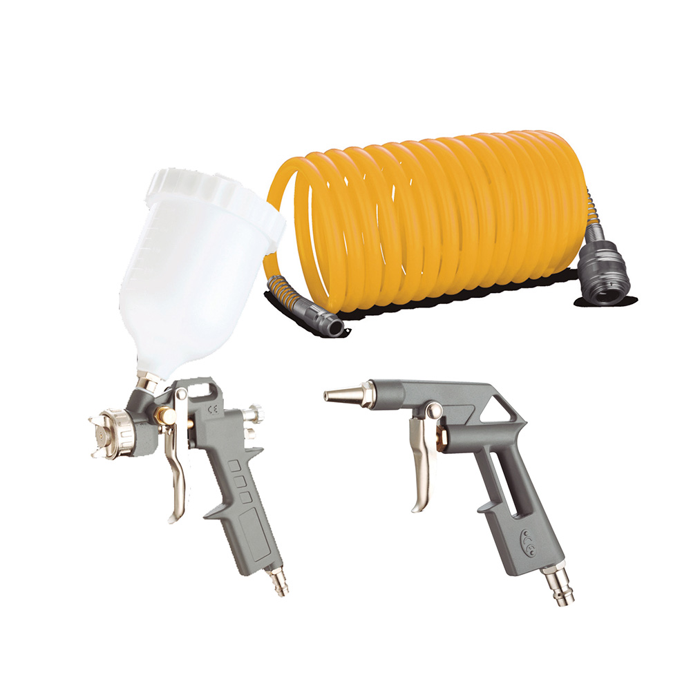 Acompanha kit de acessórios com uma pistola de limpeza, uma pistola de pintura e uma mangueira.